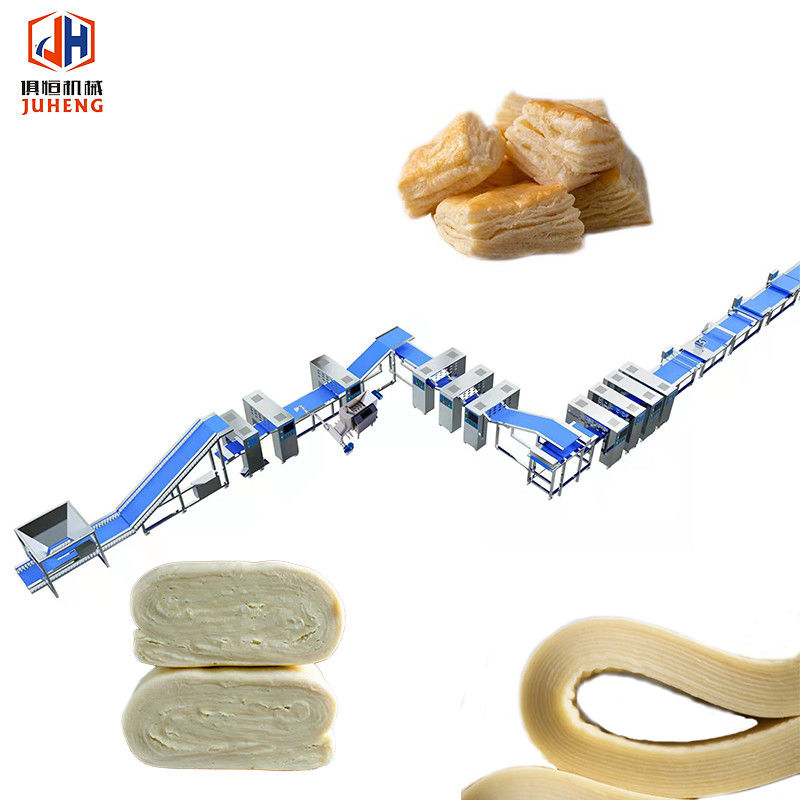 الـخط إنتاج أوراق العجين الكامل التلقائيالعمليات هي: 1تقطيع العجينة. 2المنقسم يقسم عجلة العجينة. 3يتم معالجة العجينة بشكل مبدئي، وتصبح السطح سلسًا وتصبح السماكة متساوية.4 آلية التخفيف المستمر تعالج العجين.5 آلية حقن الزبدة تضغط الزبدة بالتساوي في منتصف صفيحة العجين.7تضغط آلية التخفيف على العجين والزبدة بقوة وتستمر في طحن العجين. 8 تتراكم آلية التراكم الطبقة من العجن بطبقة، وتظهر طبقات المعجنات المضغوطة. يمكن للعملاء التحكم في عدد طبقات المعجنات المضغوطة عن طريق ضبط السرعة.91011 تكرار خطوات الترتيب والترقية.12الآلية المضغوطة ستقوم بالدوران النهائي.